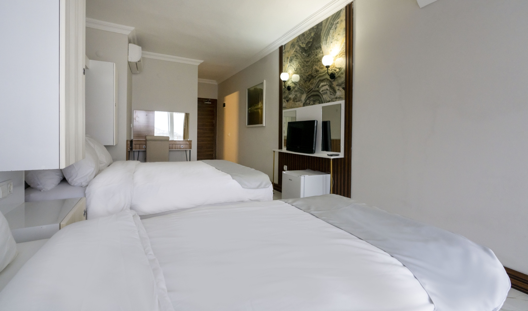 Geniş alanı ve ayrı oturma bölümüyle rahat bir konaklama sunan Aile Odaları, huzurlu bir tatil deneyimi yaşatır. Konforlu donanımı sayesinde ailenizle keyifli anlar geçirmenizi sağlar.